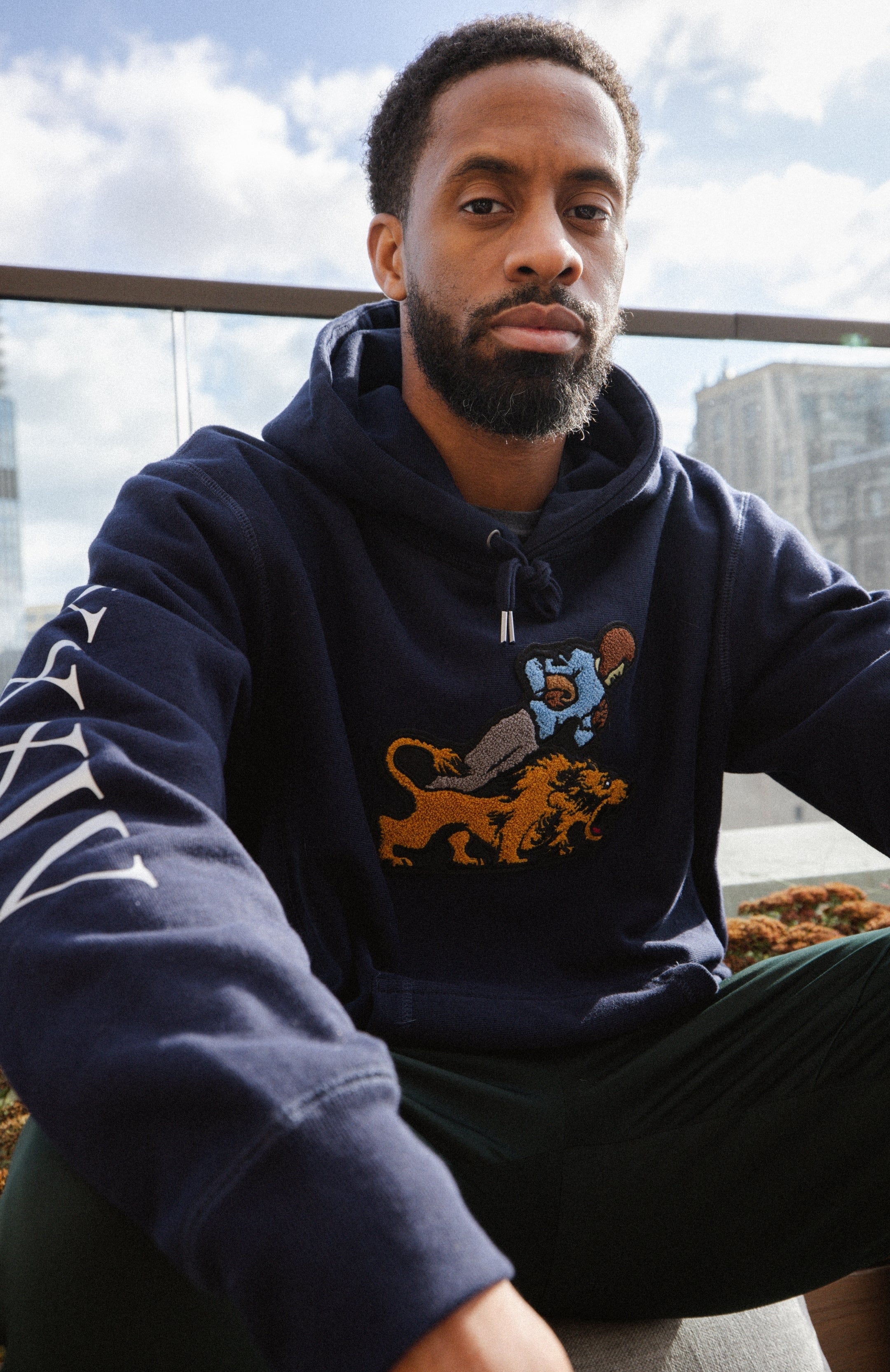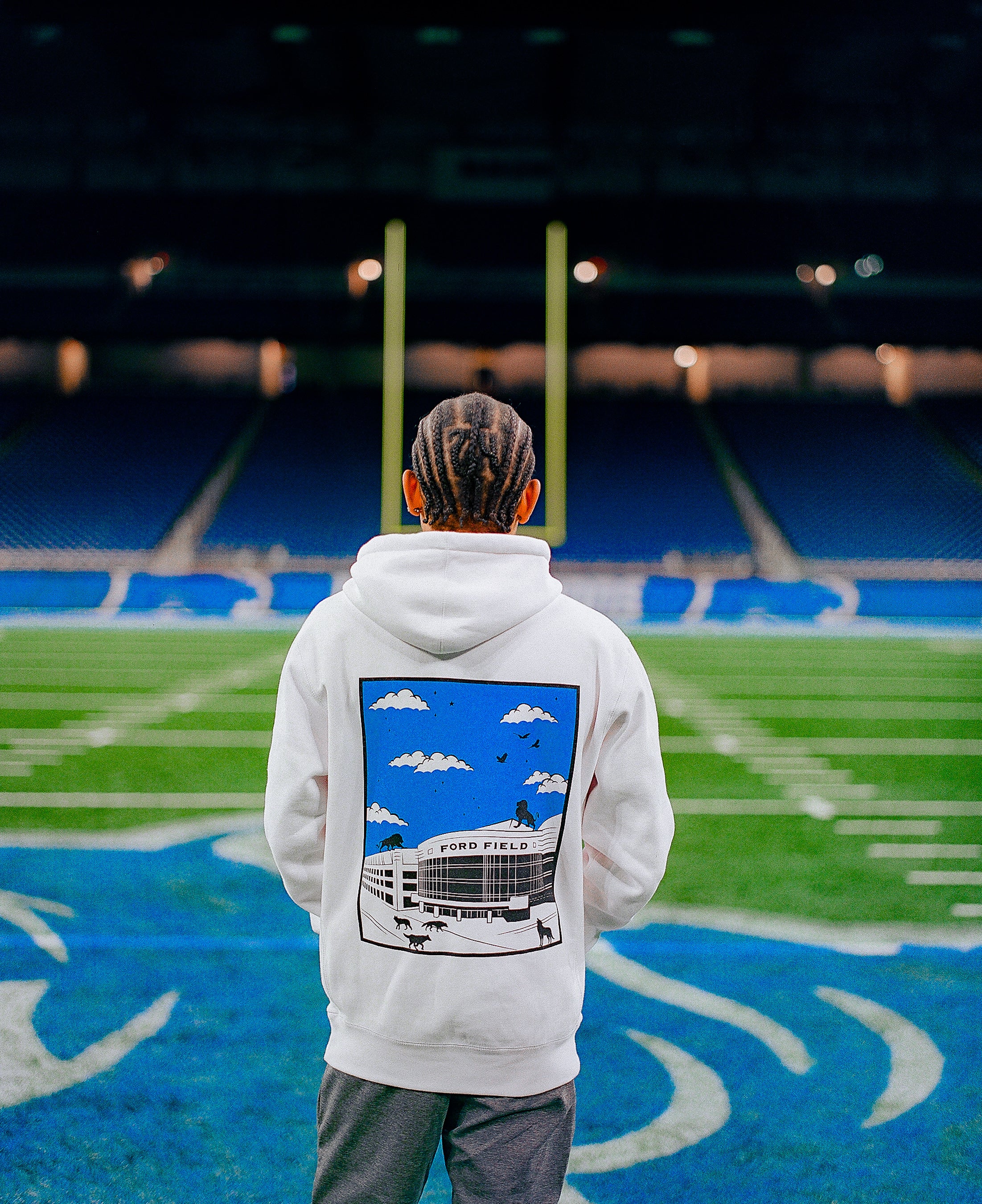 In 2023, we launched our first official collaboration with an NFL organization, our hometown team, The Detroit Lions. Our partnership has stretched throughout the season so far, kicking off with a four piece metallic collection for the Detroit Lions home opener on September 17th, 2023. Three weeks later, for their home game against the Carolina Panthers, we released The Blackout Collection, which featured two black hoodies and a black t-shirt with blacked-out chenille patch logos, printed motifs, and embroidered icons. For Thanksgiving, we delivered a limited edition hoodie featuring a chenille patch vintage Lions Logo on its chest. As the regular season came to a close, the Lions clinched an NFC North Division Championship, meaning the team will be hosting their first round playoff game at their home stadium, Ford Field. Our final installment with the Detroit Lions of the 2023 season has been delivered in the form of another limited edition hoodie, the Built For This Fireside Hoodie.