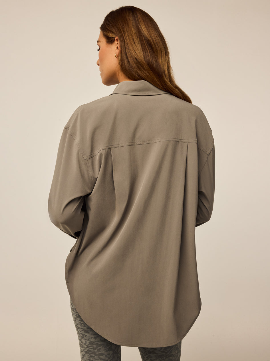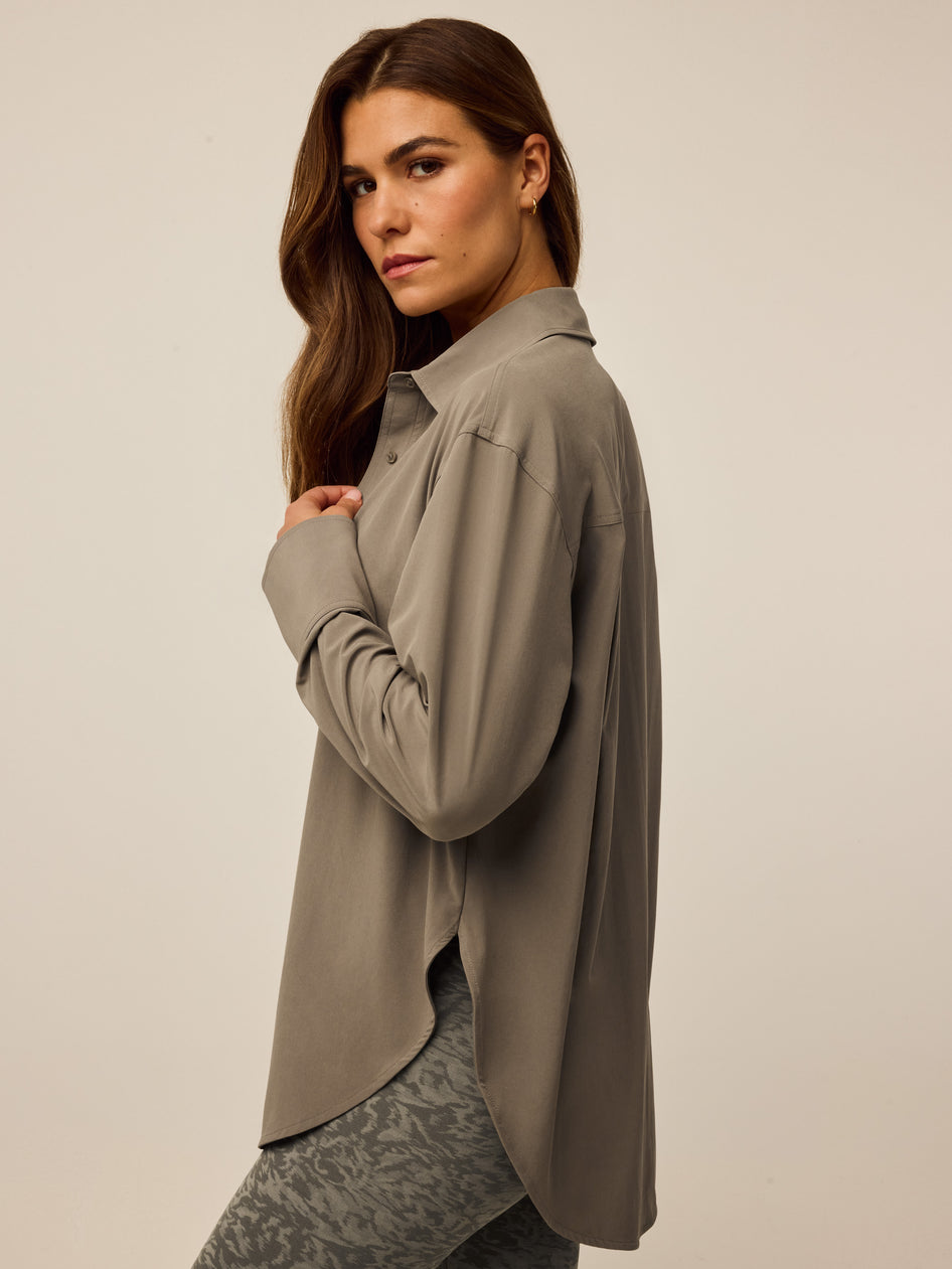 The Ashe Button Down Shirt combines lightweight fabric with stretch for all-day comfort. Designed with a refined drape, it features engraved buttons that add a polished touch. Versatile and effortless, this modern shirt transitions effortlessly between casual and elevated occasions and is ideal for warm-weather styling.