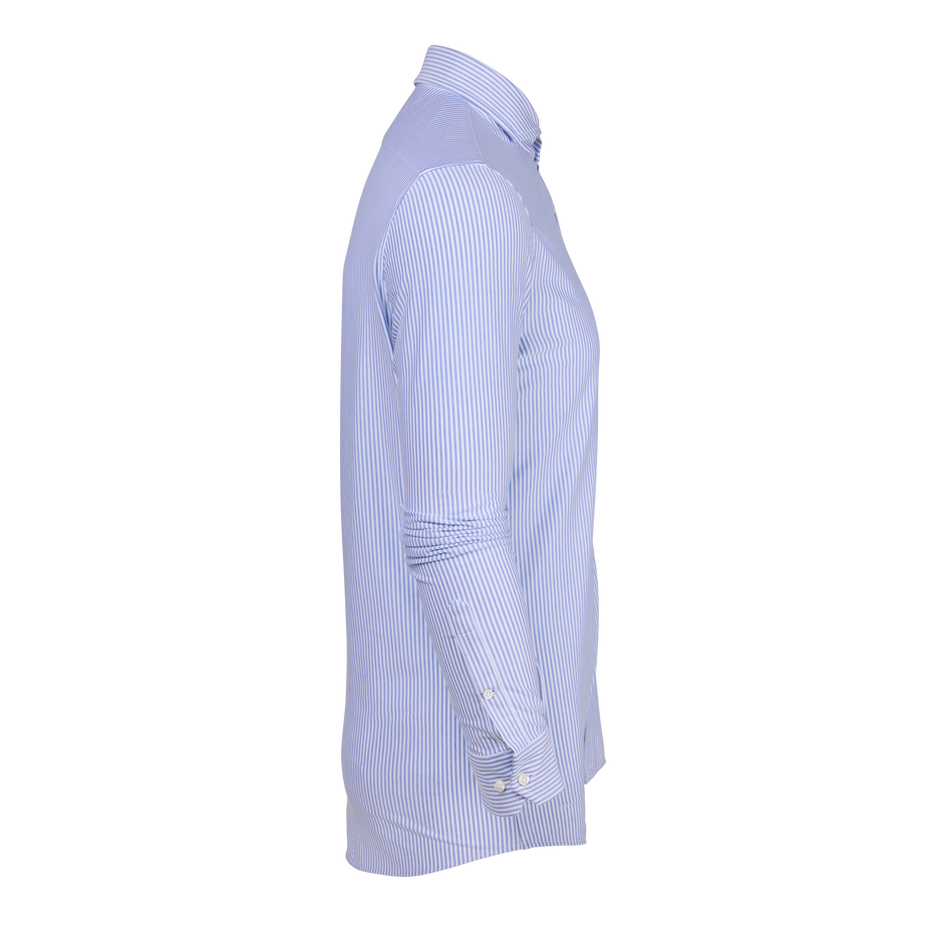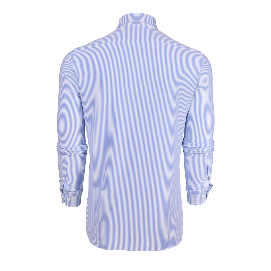 The Birmingham Striped Knit Shirt is a timeless addition to your wardrobe that can be easily dressed up or down for any occasion. Crafted from a luxurious and lightweight blend of cotton and elastane, this button-down features a knit construction with a soft, textured finish that offers enhanced stretch and flexibility, ensuring all-day comfort and breathability. Finished with a spread collar, engraved mother of pearl buttons, and mitered cuffs for a refined touch.