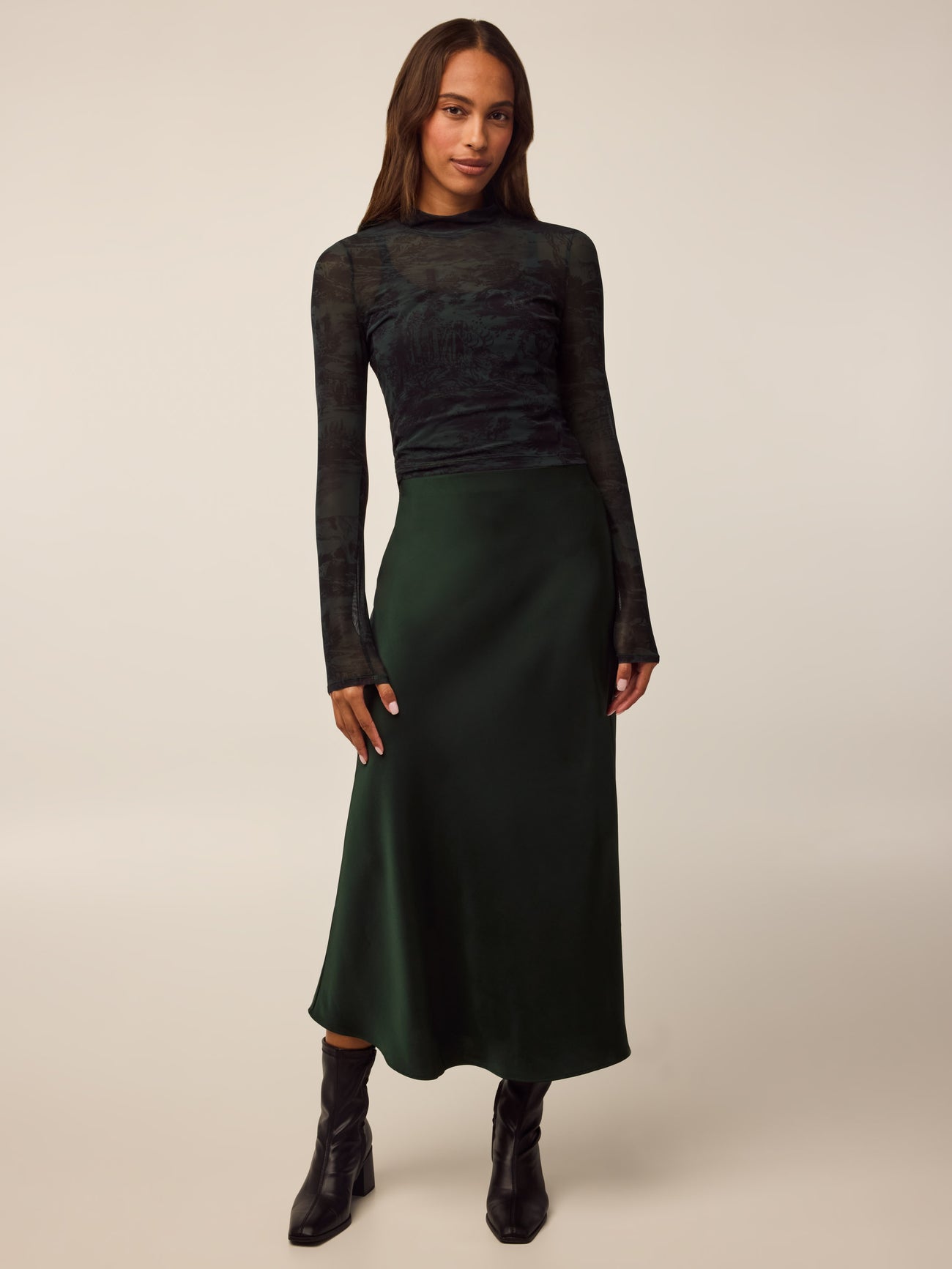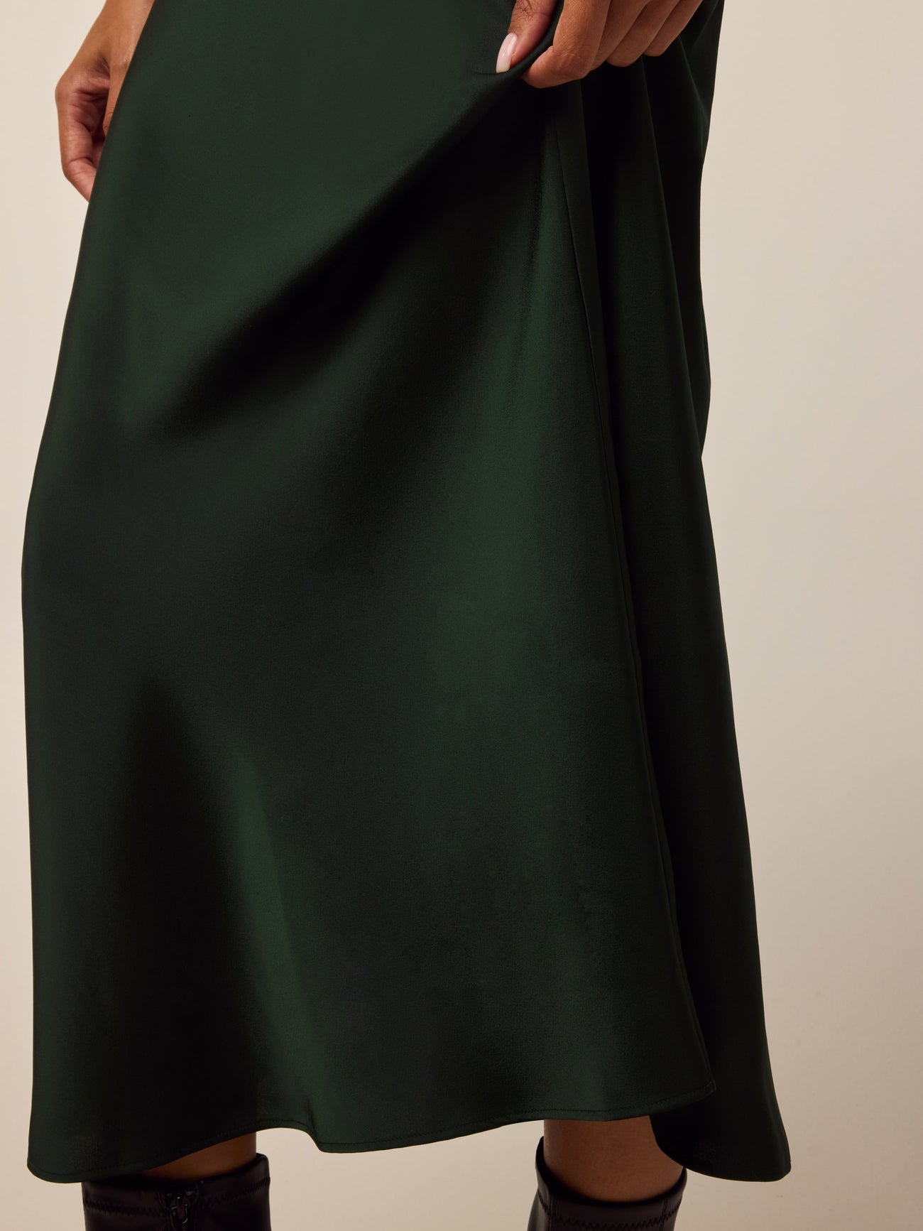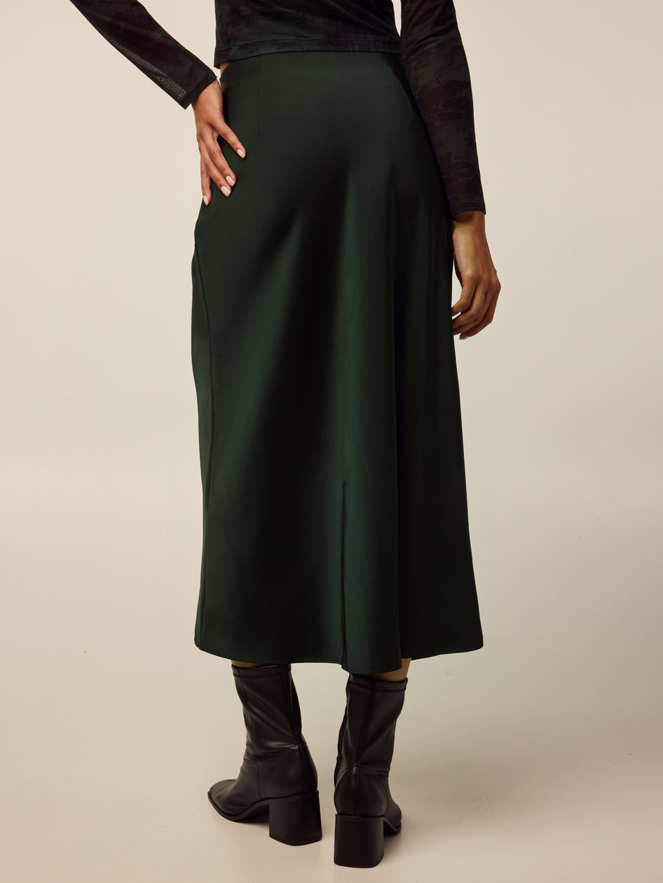 Discover the elegance of the Eris Midi Skirt, crafted from crepe back satin for a luxurious feel. Its sleek, elongating silhouette is tailored to enhance your natural curves and add sophistication to any look. Pair it with a chic cocktail top for an elevated look or dress it down with a casual tee and sandals for effortless elegance. Timeless, versatile, and effortlessly stylish, this skirt is a wardrobe essential for the season.