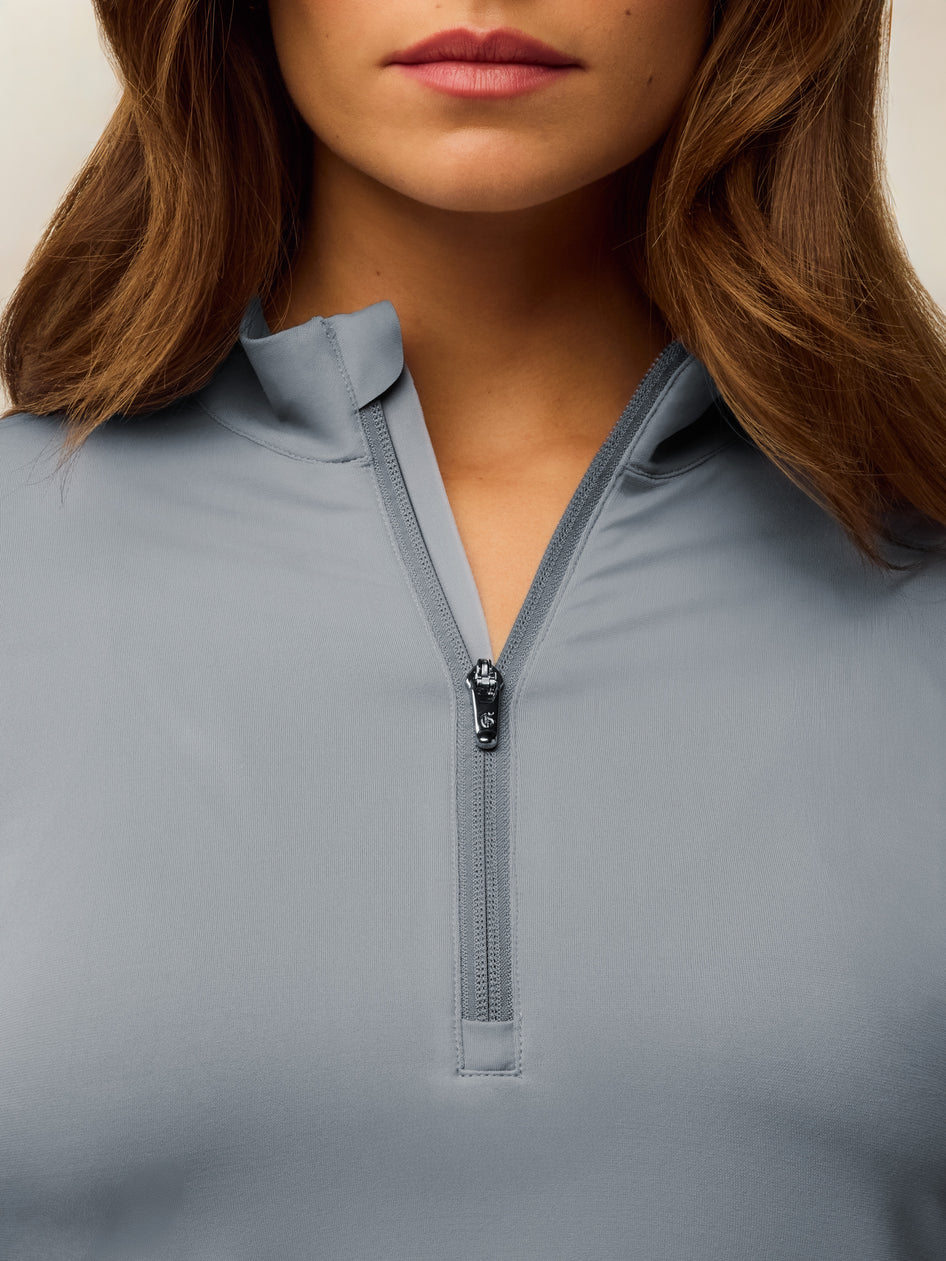 The Halley Long Sleeve Quarter-Zip crafted from luxurious Italian fabric, delivering superior stretch and performance with a luxe feel. Designed with a slim, athletic fit, this lightweight pullover is breathable and provides UPF 50 protection for versatile, year-round wear. The quarter-zip construction is finished with thumbholes for functionality and the signature GREYSON logo on the left side. Perfect for sport or everyday wear, pair it with your favorite skirt or pant for a polished, athletic look.