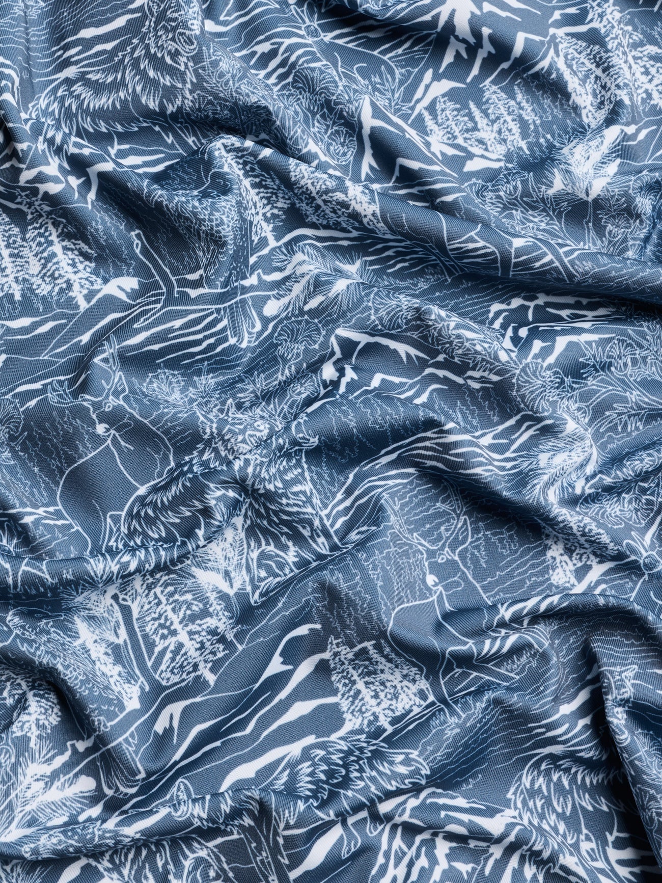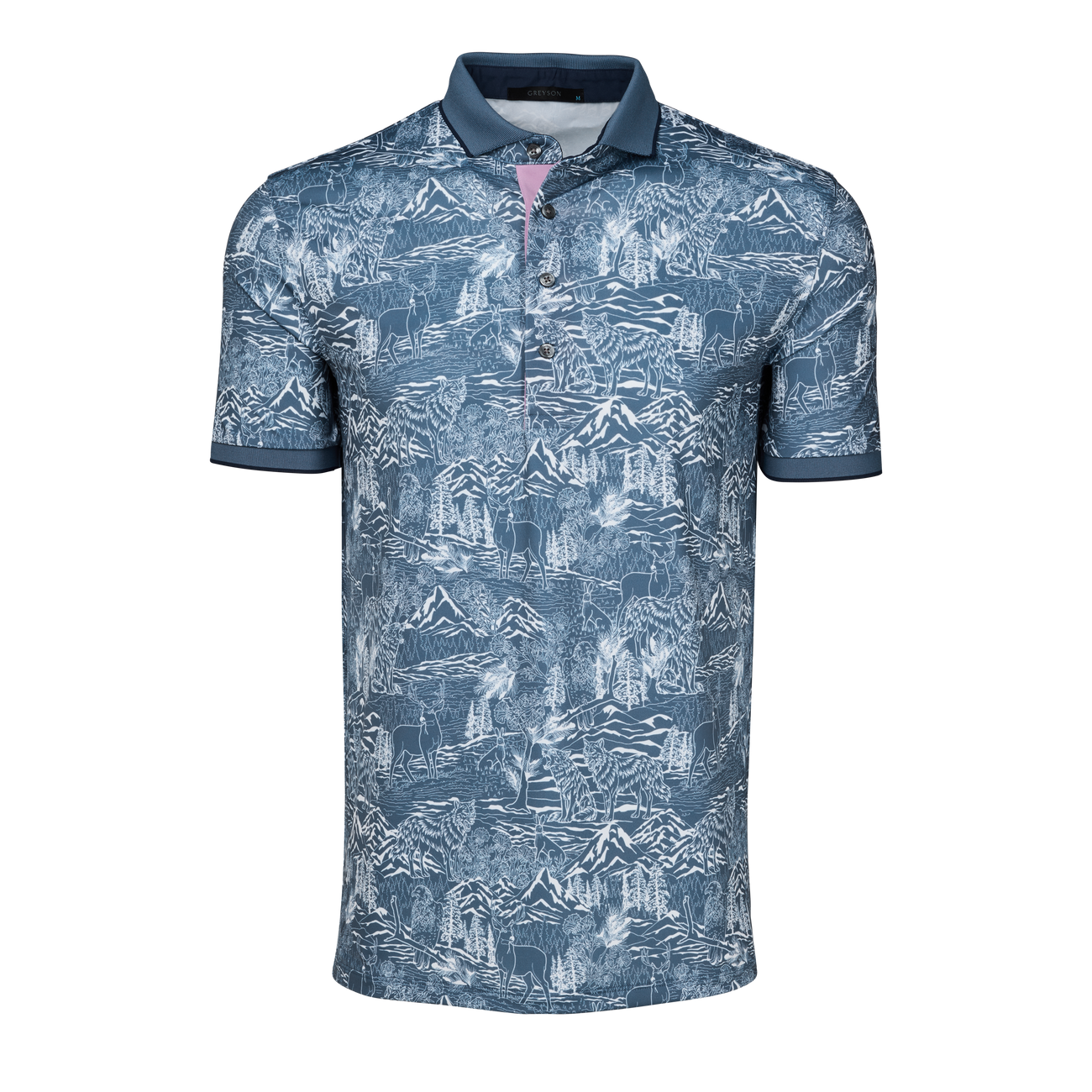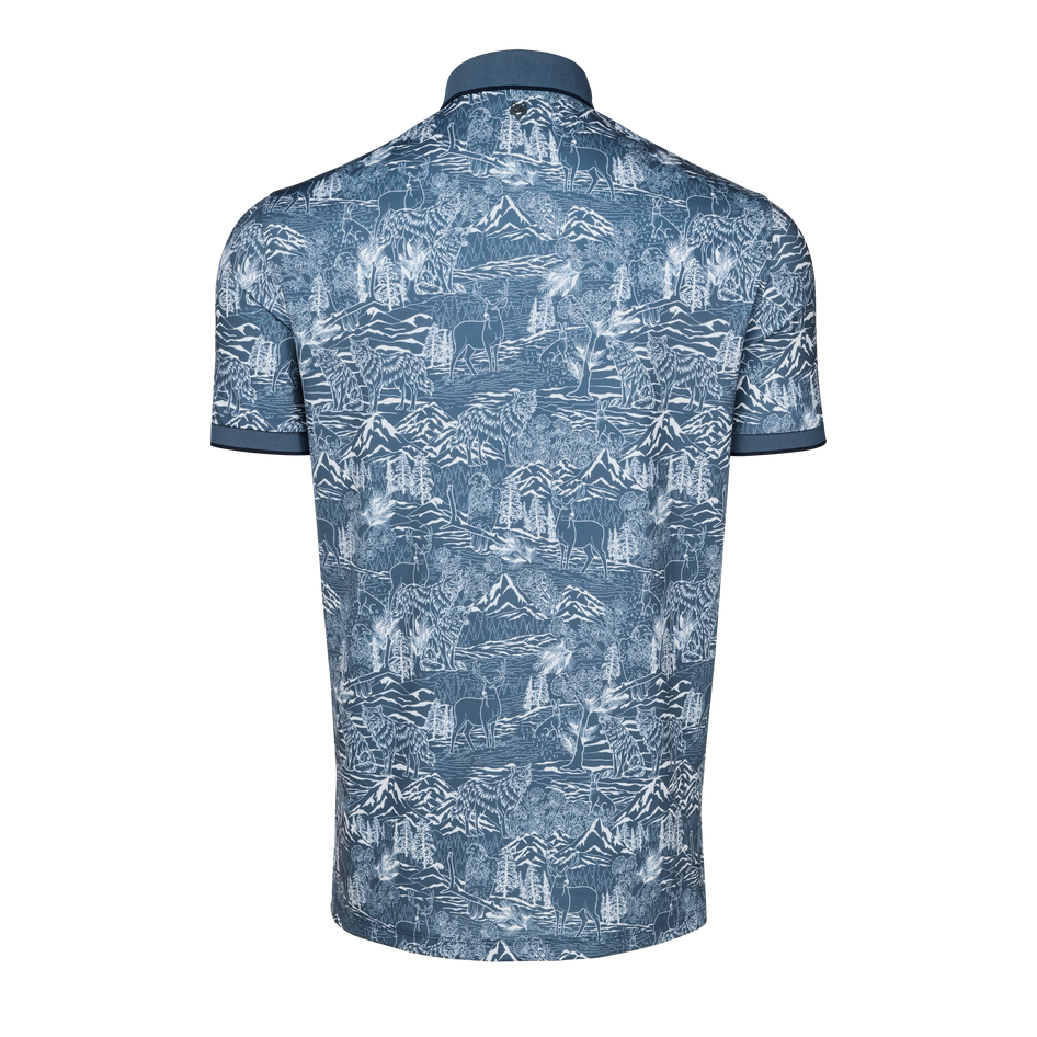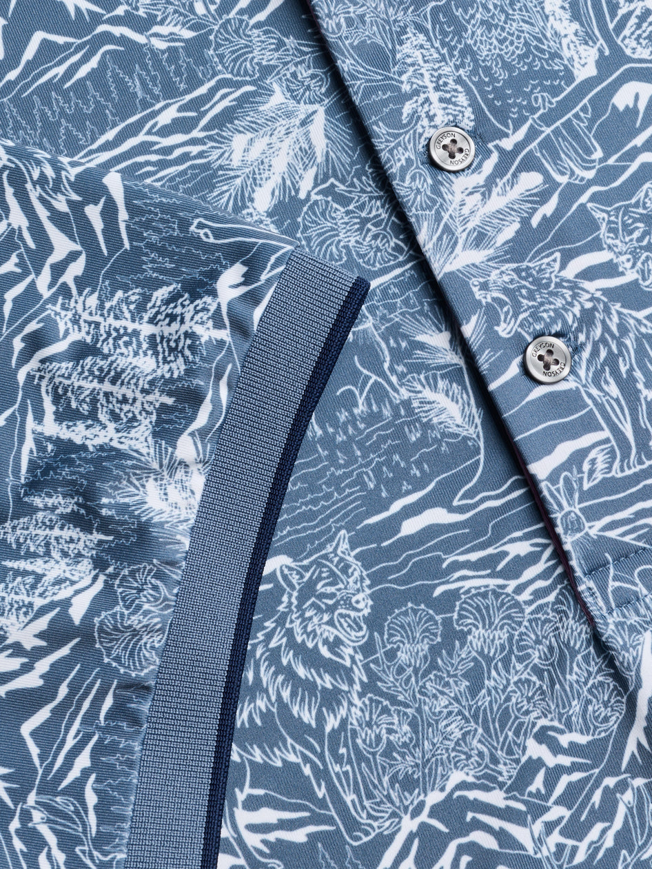 The In the Valley Short Sleeve Polo showcases an intricate nature-inspired print, artfully depicting wolves, mountain ranges, and forest landscapes on lightweight performance fabric that offers breathability, quick-drying comfort, and anti-odor technology. A knit cutaway collar and matching cuffs frame the four-button placket, accented with contrast detailing under and at the top facing. A statement piece designed to perform as well as it looks.