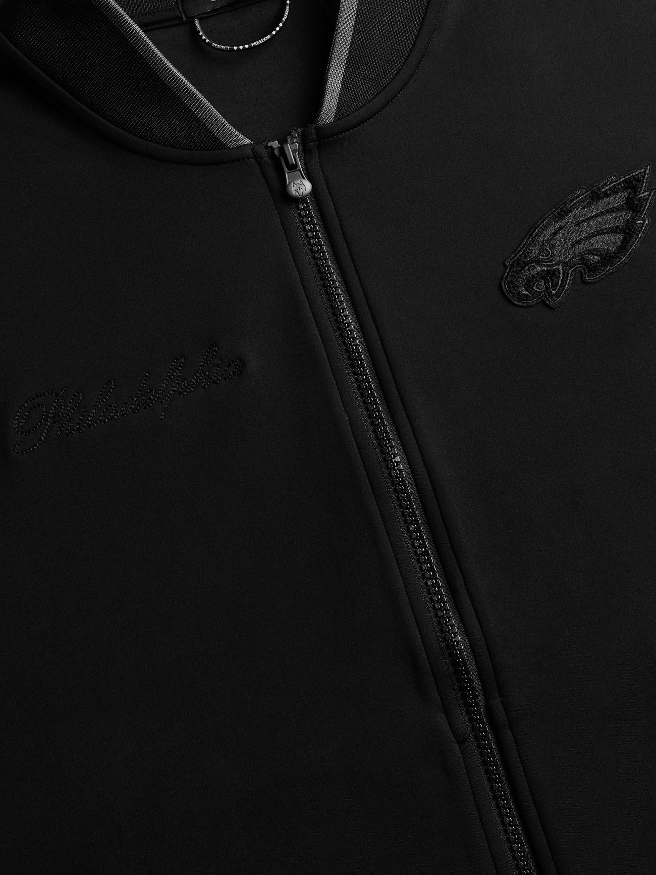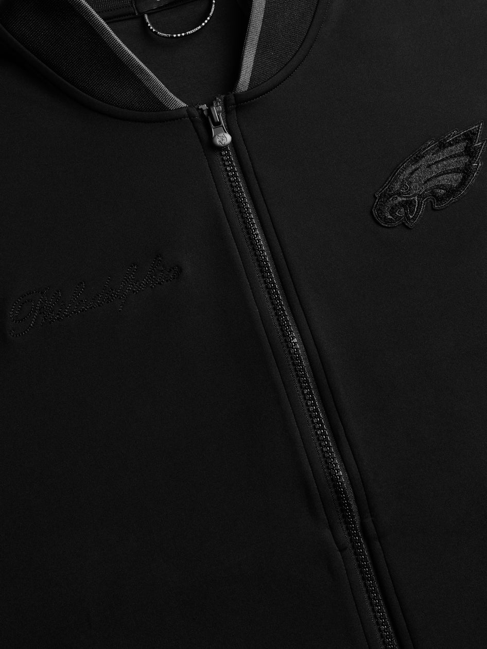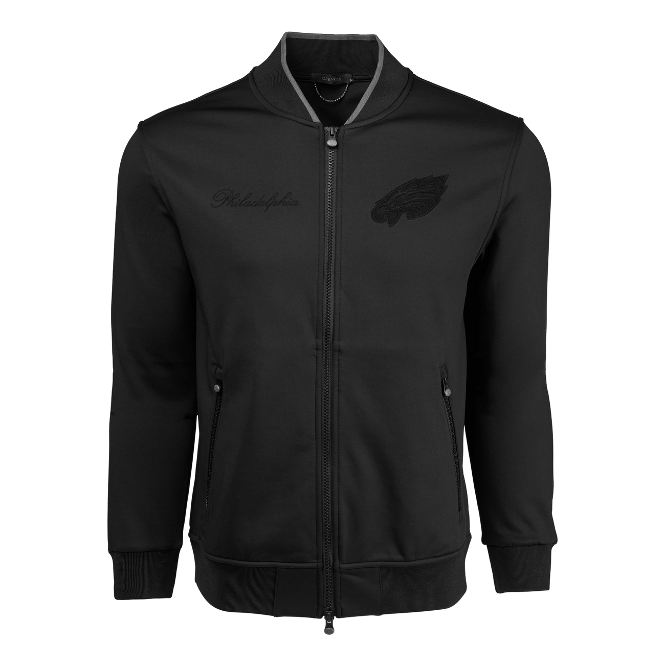 The Philadelphia Eagles Blackout Sequoia Bomber Jacket combines refined tailoring with technical performance. Crafted from premium Italian fabric, it balances a refined, technical side with a soft, wicking interior. Designed for movement, it offers 4-way stretch, breathability, and built-in UV protection. The jacket’s clean silhouette is elevated yet versatile, making it ideal for day-to-night styling. Subtle detailing ensures a sophisticated, understated finish. This custom product is part of a limited Greyson x Philadelphia Eagles capsule from our Greyson for the NFL collection.