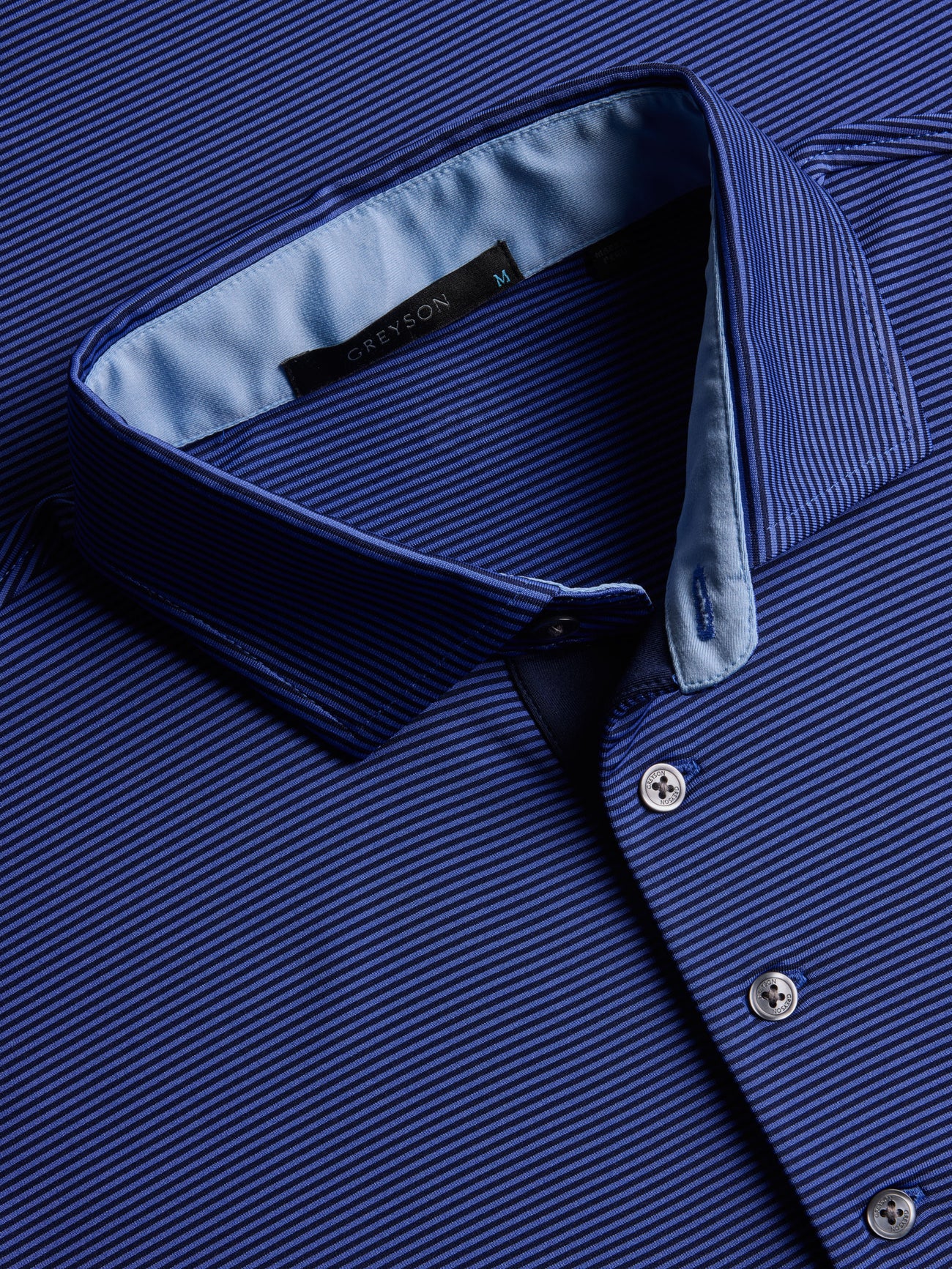 A classic stripe that transitions effortlessly from the golf course to every part of your lifestyle. Constructed with a blend of polyester and spandex fabric, the Saranac is finished with a sateen wash creating a silky hand. This mini feed striped polo features a four button placket with a pop of color on the neck and placket.