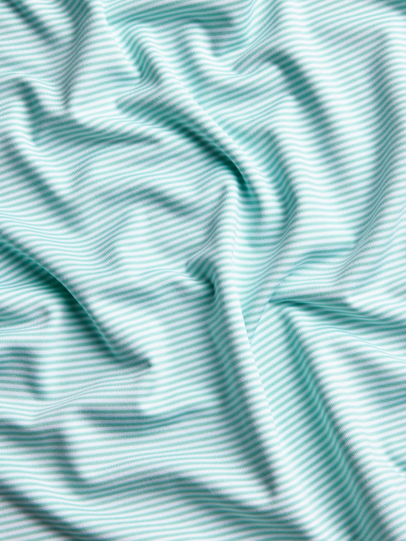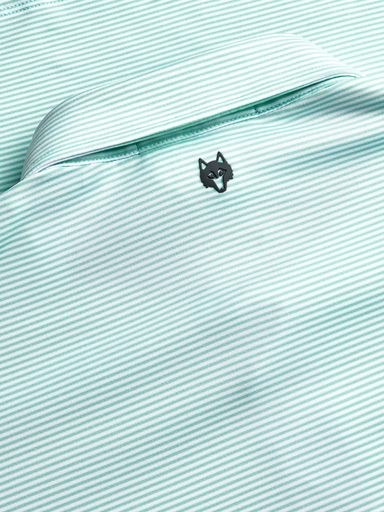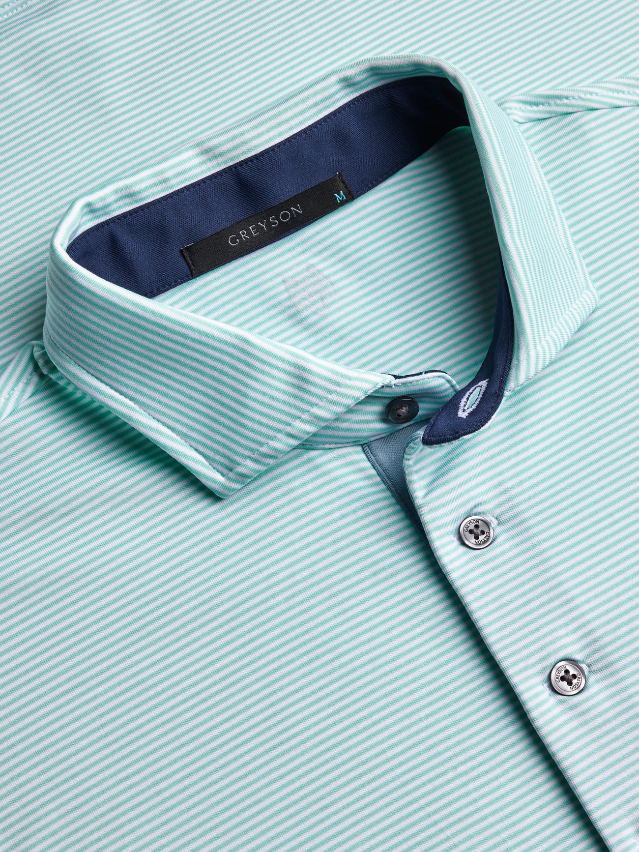 A classic stripe that transitions effortlessly from the golf course to every part of your lifestyle. Constructed with a blend of polyester and spandex fabric, the Saranac is finished with a sateen wash creating a silky hand. This mini feed striped polo features a four button placket with a pop of color on the neck and placket.