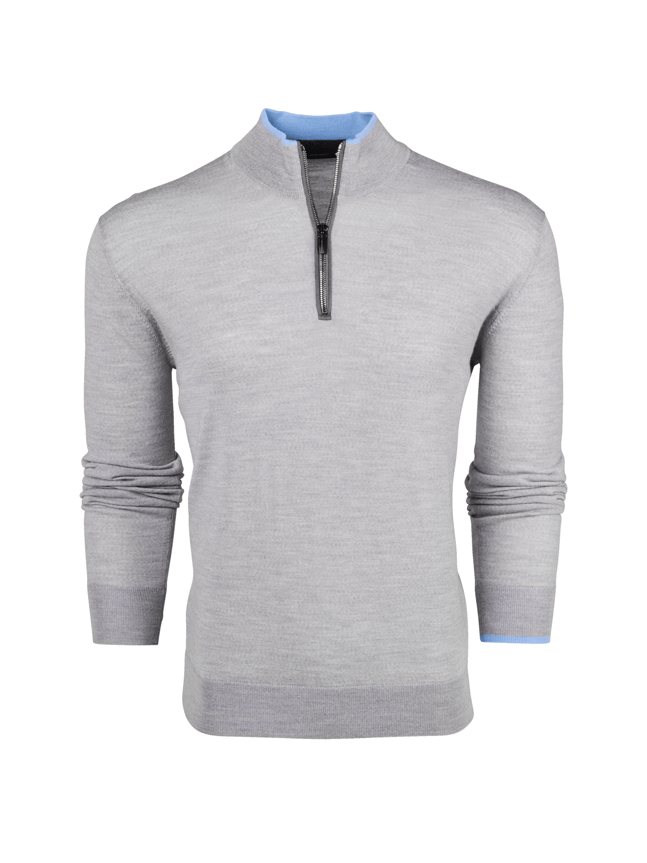 The Saratoga Quarter-Zip Sweater is crafted from 100% merino wool for lightweight warmth that is exceptionally soft. It features suede taping on the zipper placket and a crafted horn pull, along with Greyson's signature color-contrast tipping on the left sleeve. Finished with rib-knit sleeves, collar, and hem.