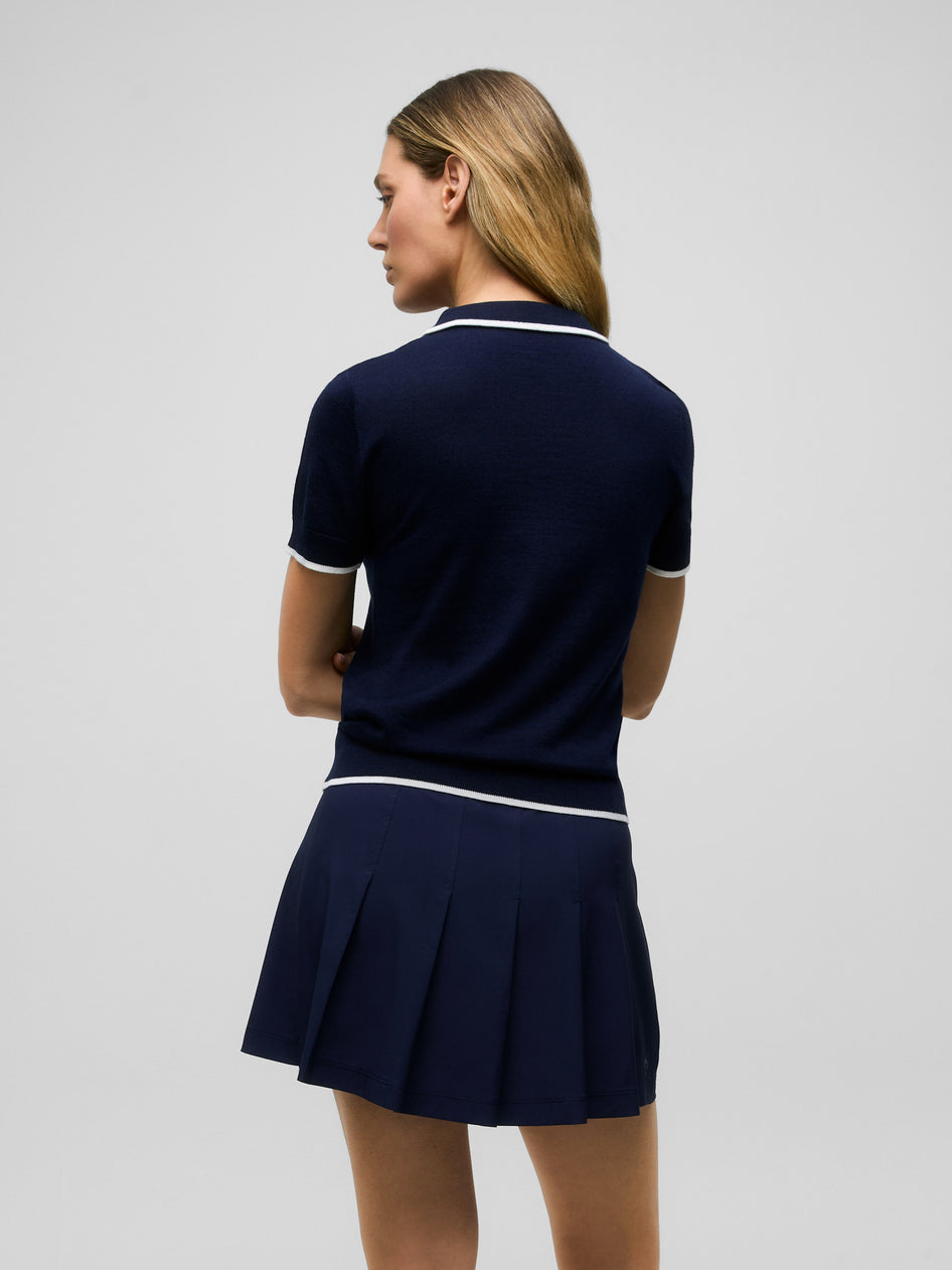 The Leith Merino Script Short Sleeve Sweater Polo is a timeless addition to your seasonal wardrobe. Made with a premium blend of wool, which provides unparalleled warmth, and silk, which adds a delicate touch is super soft.This elevated blend does not only deliver superior comfort, but also makes a statement in every occasion. Finished with ribbed cuffs and hem for a sophisticated touch.