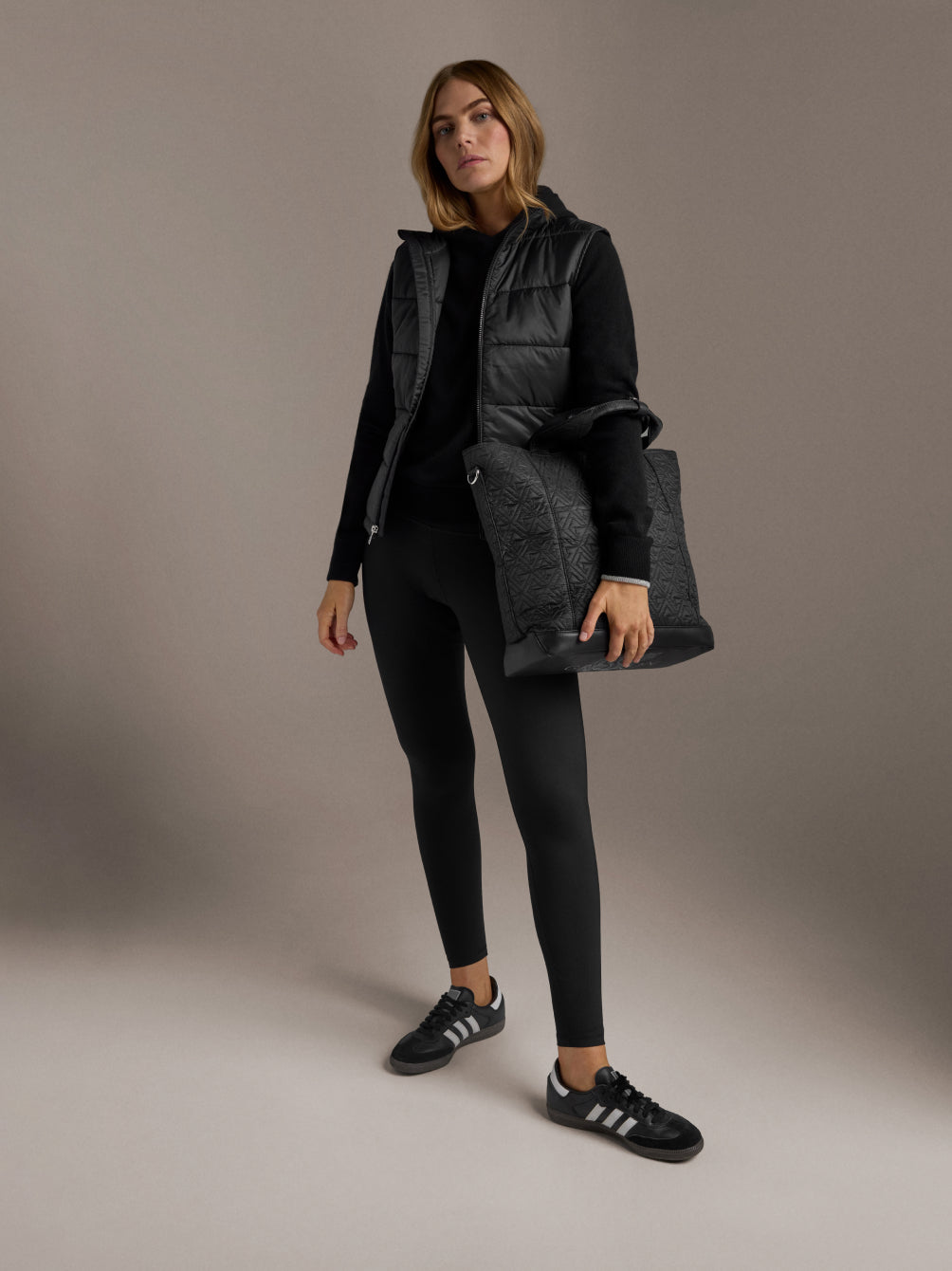 Product displayed is the Classic Koko Hoodie in Shepherd, the Cleo Legging in Shepherd, the Aries X-Lite Vest in Shepherd, and the Leland Tote in Shepherd.