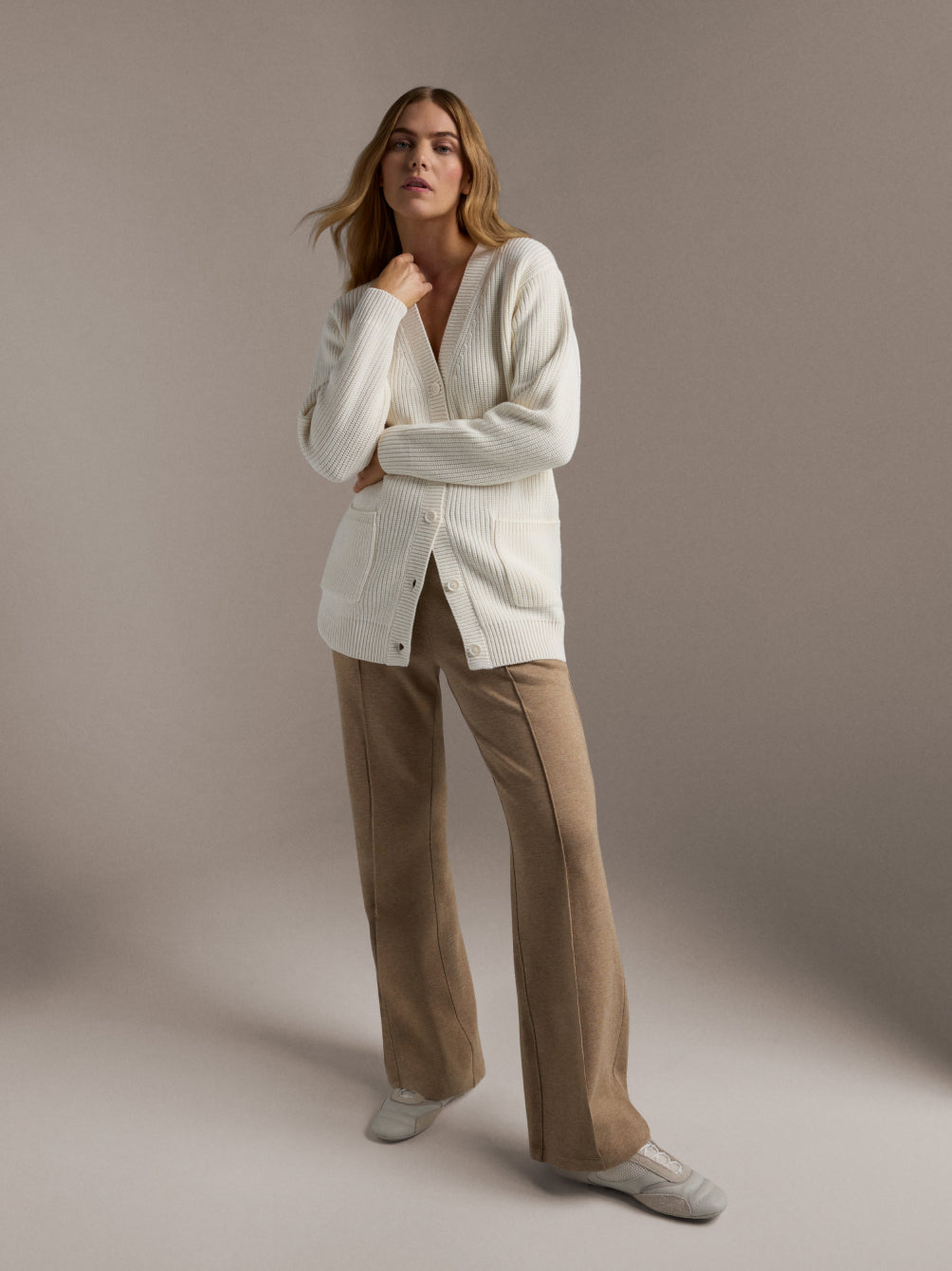 Product displayed is the Athena Button-Down Cardigan in Dove and the Ojai Luxe Pant in Clay Heather.