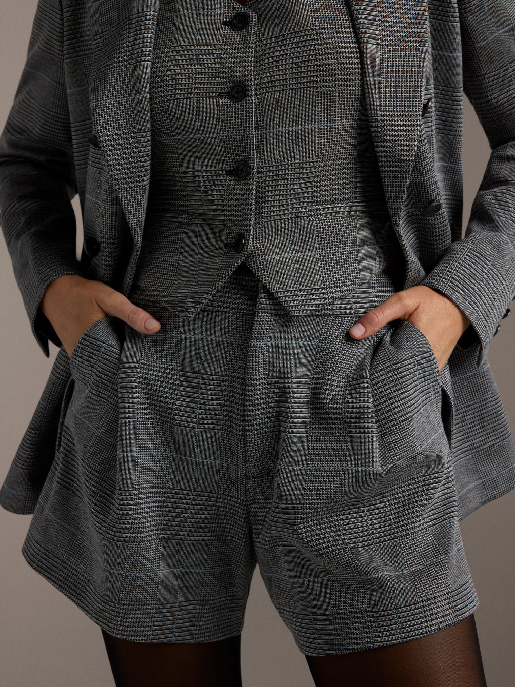 Product displayed is the Glen Plaid Blazer in Smoke Heather, the Glen Plaid Vest in Smoke Heather, and the Glen Plaid Trouser Short in Smoke Heather.